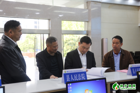 图为县委书记何德波一行在县综治中心调研
