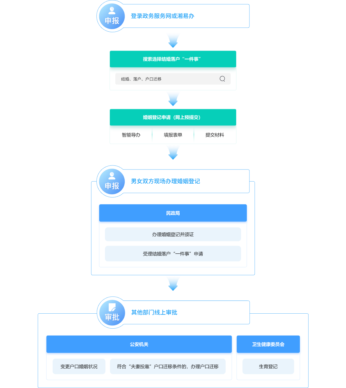 省内居民办理婚姻登记后,公安部门根据接收的当事双方签名确认的《结婚落户“高效办成一件事”申请表》、居民身份证、居民户口簿和婚姻登记信息数据,线上申请变更户口婚姻状况。(如当事人有尚未办结的户籍业务,应在办结后,再按上述流程申请婚姻状况变更)。