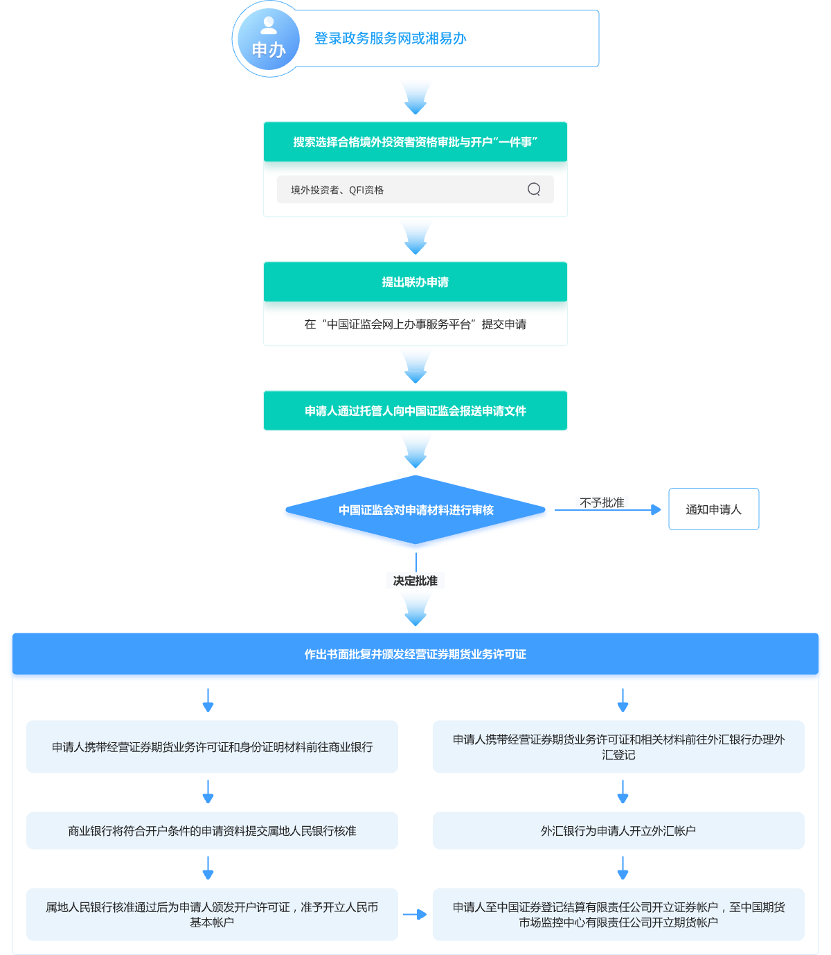 将合格境外投资者资格审批与开户涉及多部门的合格境外投资者资格审批、经营证券期货业务许可证核发、证券账户开立、期货账户开立、外汇登记、基本账户开立等多个事项整合为“高效办成一件事”,实现“一次告知、一表申请、一网受理、一站服务”