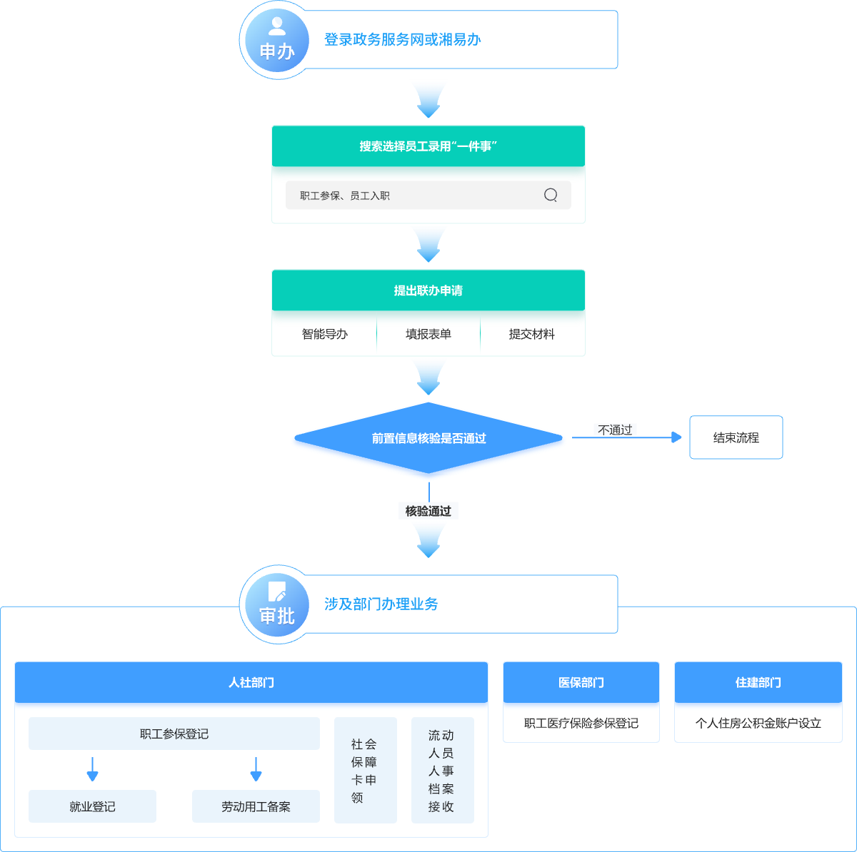 企业在录用员工时可匹配选择相应政务服务事项,将职工参保登记、就业登记、劳动用工备案、个人住房公积金账户设立、职工医疗保险参保登记、社会保障卡申领、流动人员人事档案接收等集成为“一件事”,实现“一件事一次办”在线办理。