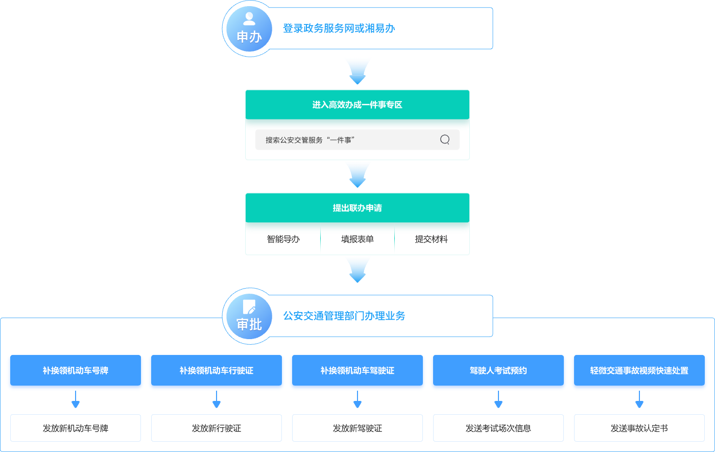 将补换领机动车号牌、补换领机动车行驶证、补换领机动车驾驶证、驾驶人考试预约、轻微交通事故视频快速处置等多个事项整合为“高效办成一件事”,实现“一次告知、一表申请、一网受理、一站服务”。